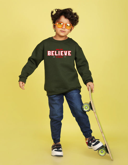NUSYL Boy's Olive Believe text Printed Oversized Round neck Sweatshirt