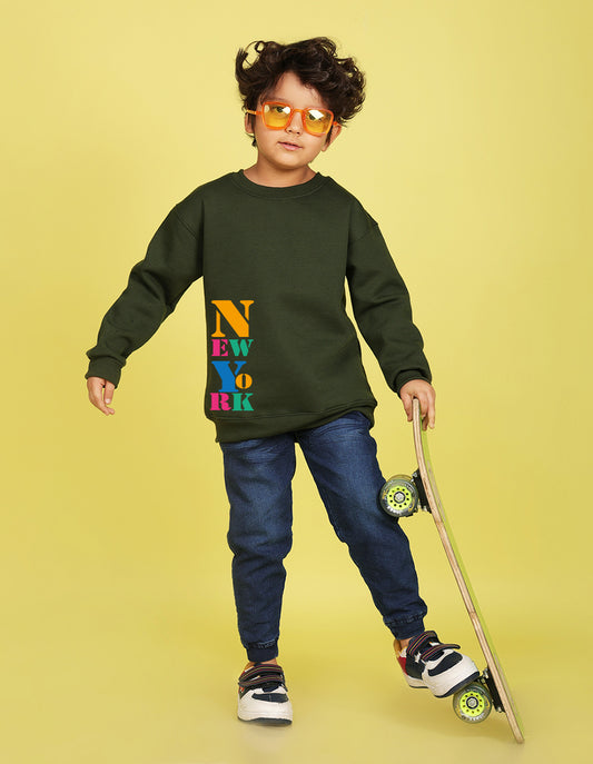 NUSYL Boy's Olive New York text Printed Oversized Round neck Sweatshirt