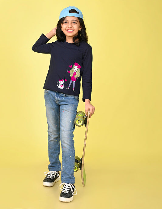 NUSYL Cotton blend full sleeves Cute Girl & Cute cat Printed Tee-Navy Blue