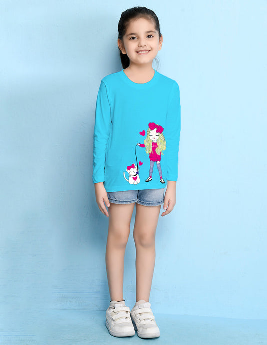 NUSYL Cotton blend full sleeves Cute Girl & Cute cat Printed Tee-Sky Blue