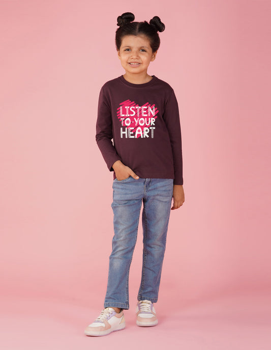 NUSYL Cotton blend full sleeves Listen to your heart text Printed Tee-Wine