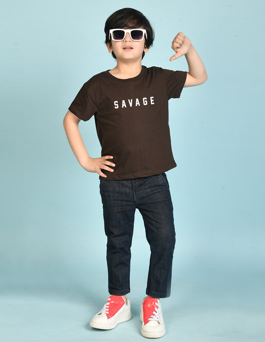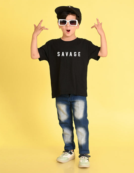 Nusyl Boys Black Savage Text Printed Short sleeve Cotton Blend Oversized T-shirts
