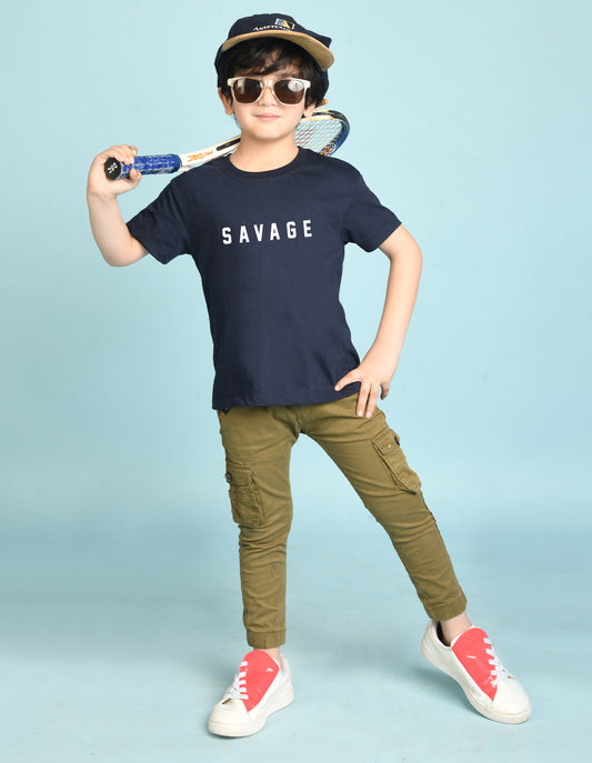 Nusyl Boys Navy Blue Savage Text Printed Short sleeve Cotton Blend Oversized T-shirts