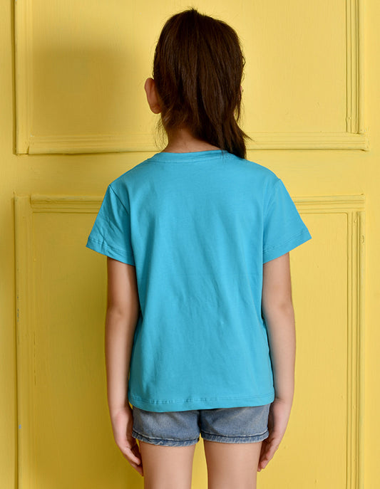 Nusyl Girls Sky Blue Girls & Text Printed Cotton Half Sleeve Regular Fit T-Shirts for Girls