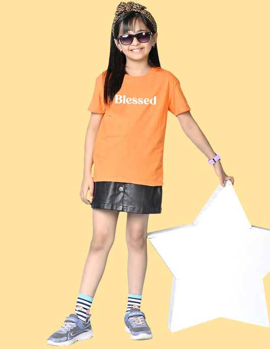 Nusyl Girls Orange Blessed Text Printed Short sleeve Cotton Blend Oversized T-shirts