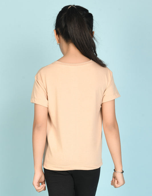 Nusyl Girl's Beige Cat Face & Selfie Queen Text Printed Regular Fit T-Shirt