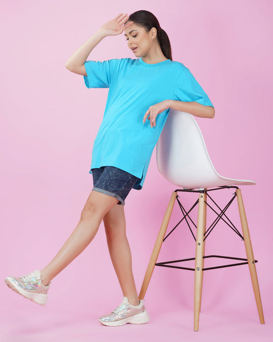 Nusyl Women Sky Blue Solid oversized t-shirt