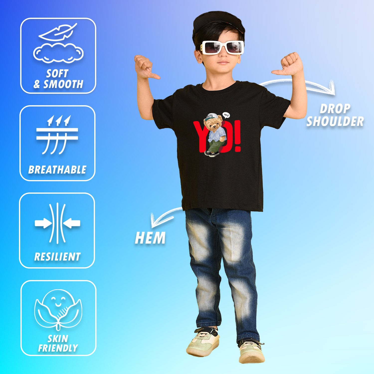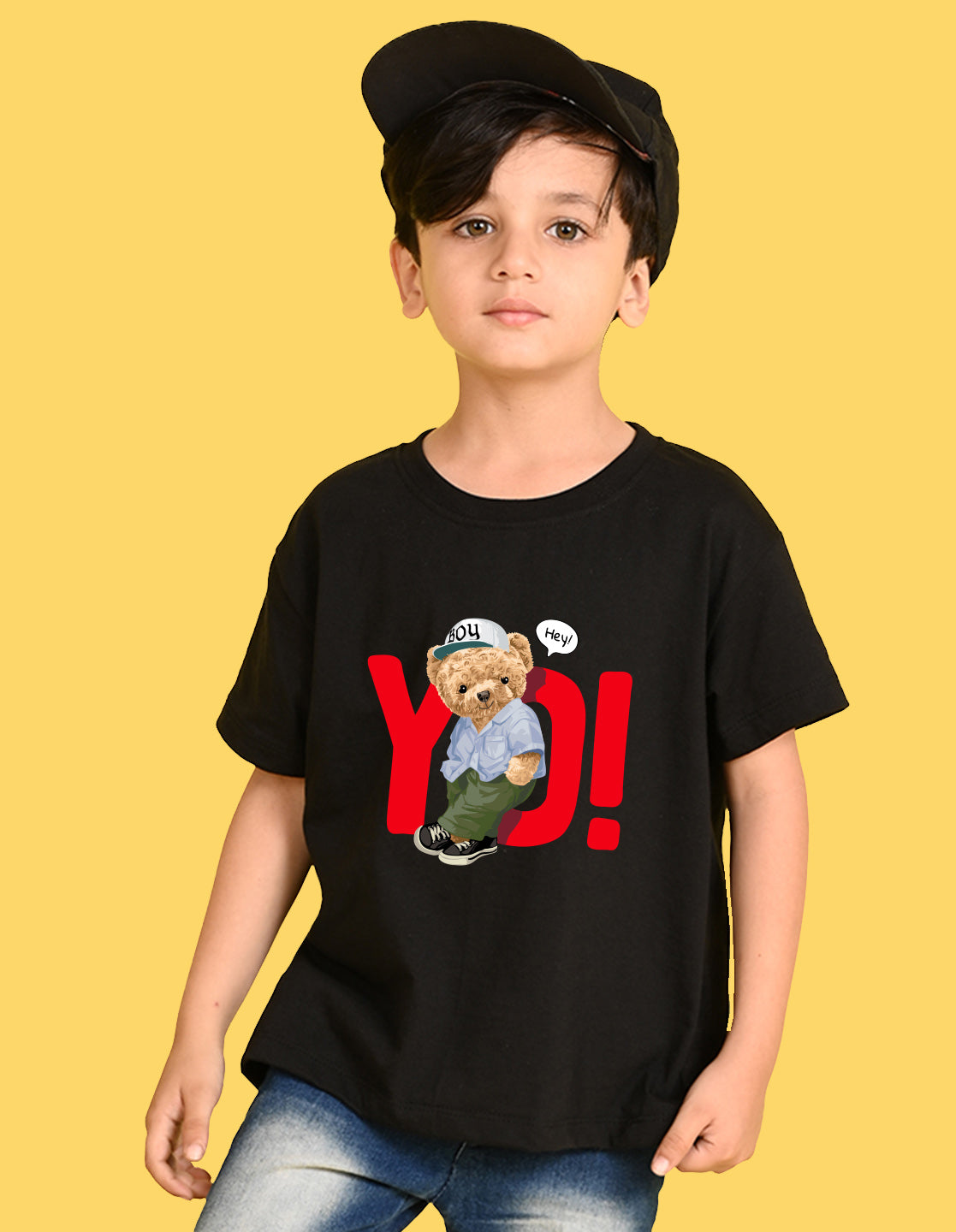 Nusyl Boys Black Teddy Bear & Text Printed Short sleeve Cotton Blend Oversized T-shirts