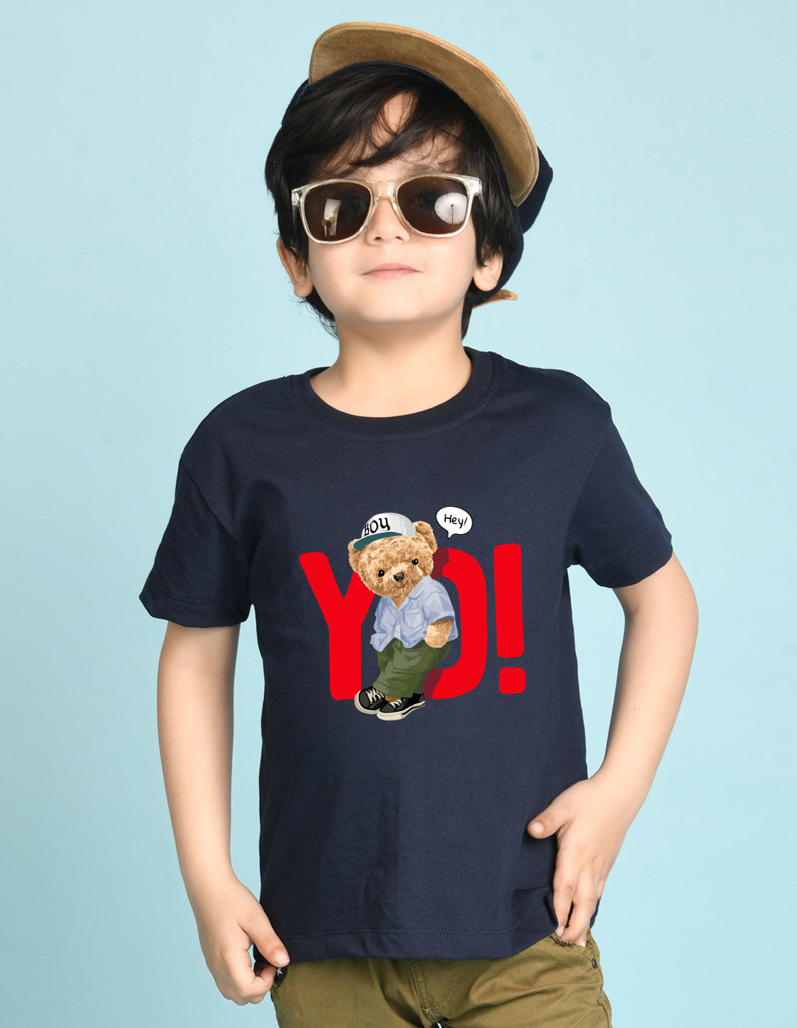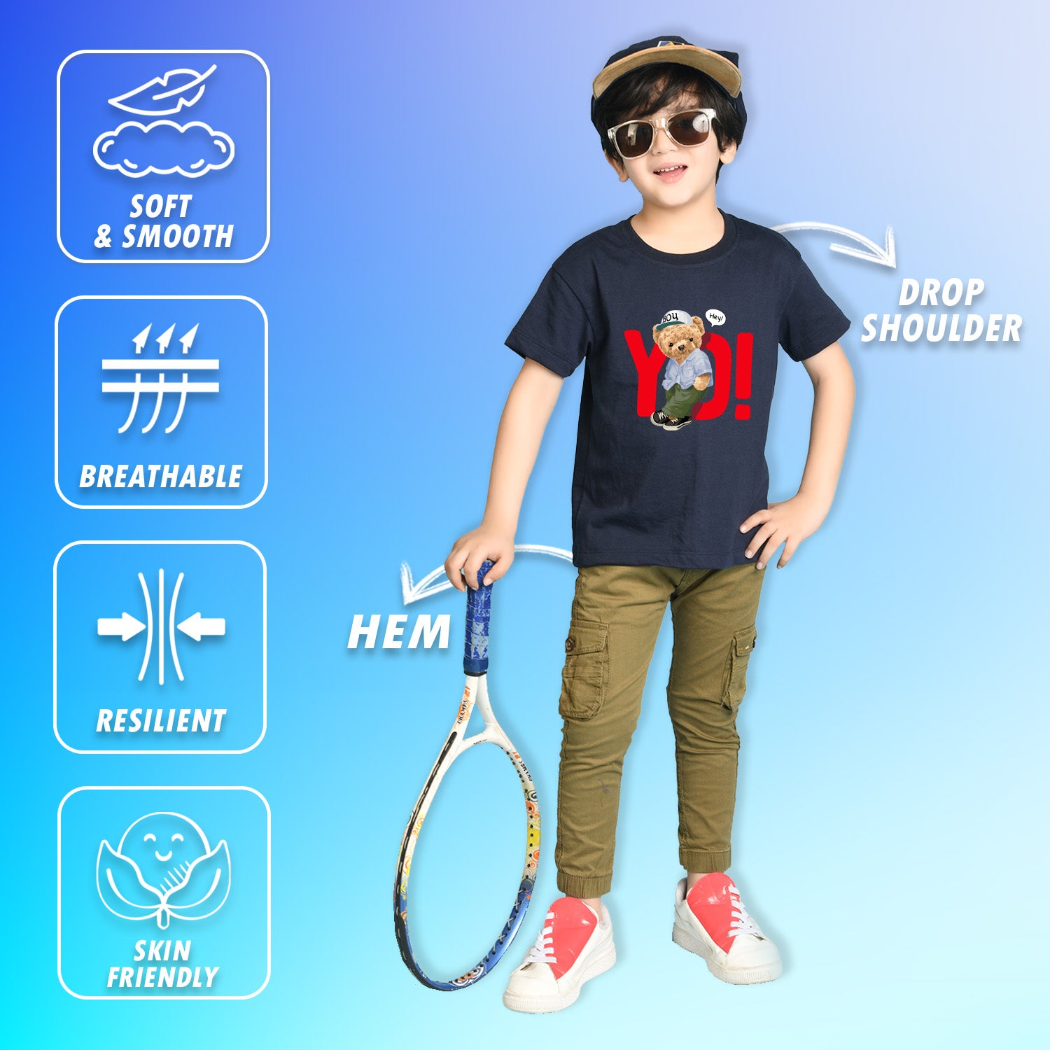 Nusyl Boys Navy Blue Teddy Bear & Text Printed Short sleeve Cotton Blend Oversized T-shirts