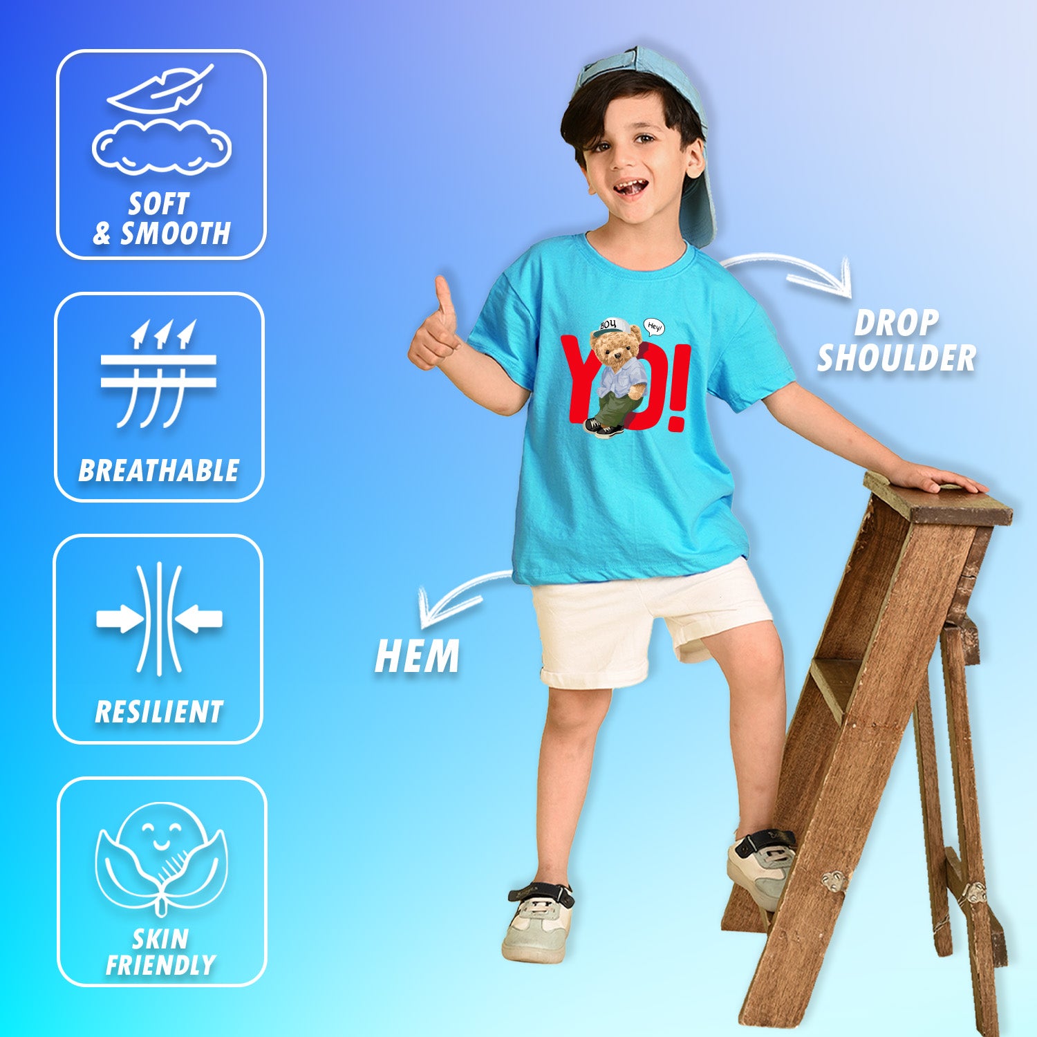 Nusyl Boys Sky Blue Teddy Bear & Text Printed Short sleeve Cotton Blend Oversized T-shirts