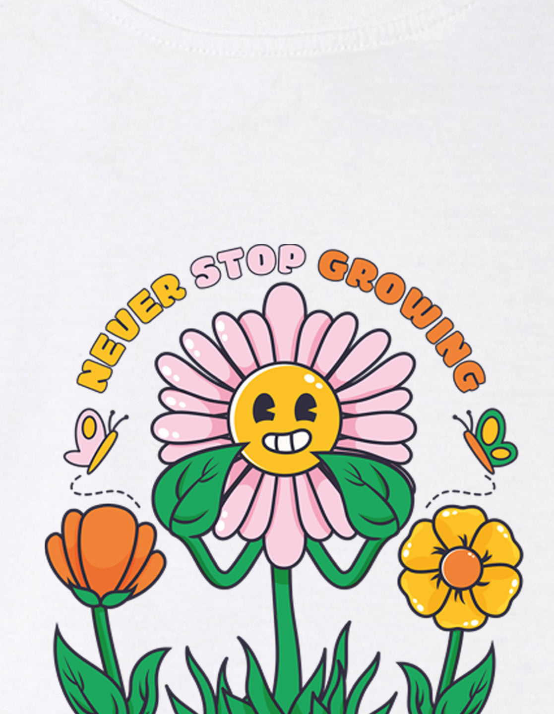 Nusyl Girl's White Smiley Face Flower Printed Cotton blend Half Sleeve Drop Shoulder Oversized T-Shirt