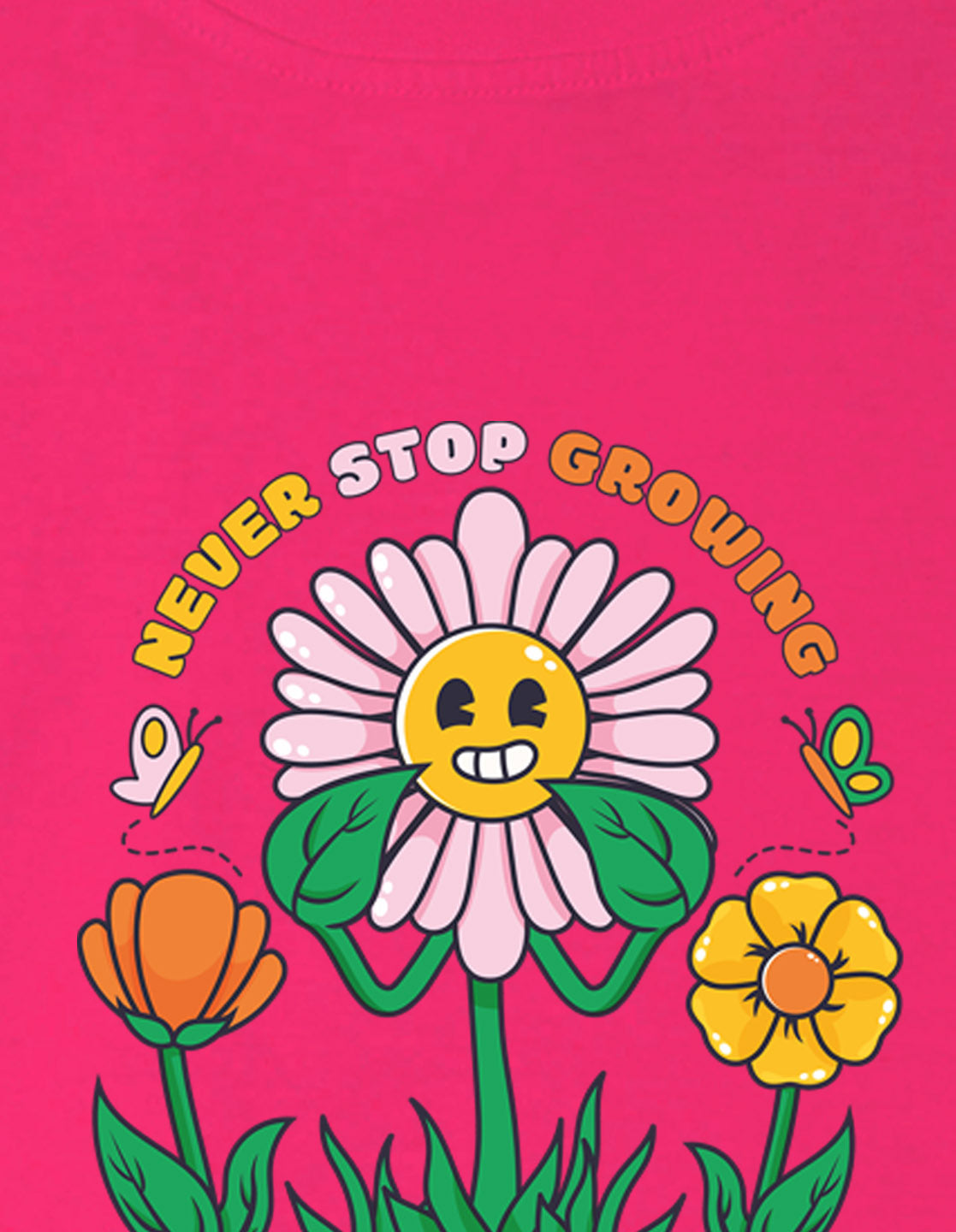 Nusyl Girl's Hot Pink Smiley Face Flower Printed Cotton blend Half Sleeve Drop Shoulder Oversized T-Shirt