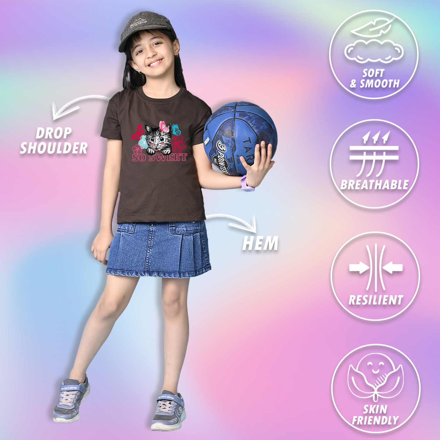 Nusyl Girls Brown cat & so sweet text Printed Short sleeve Cotton Blend Oversized T-shirts
