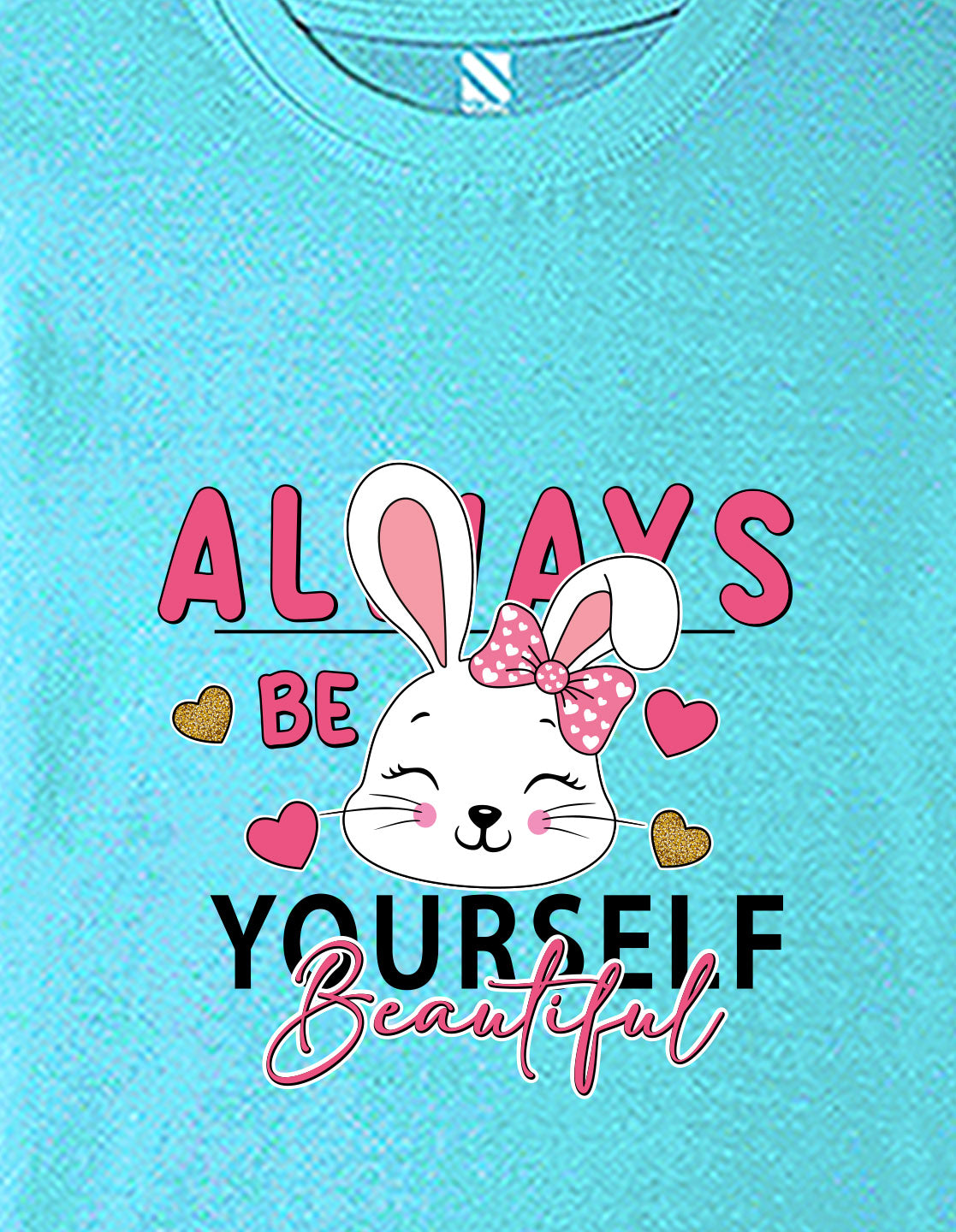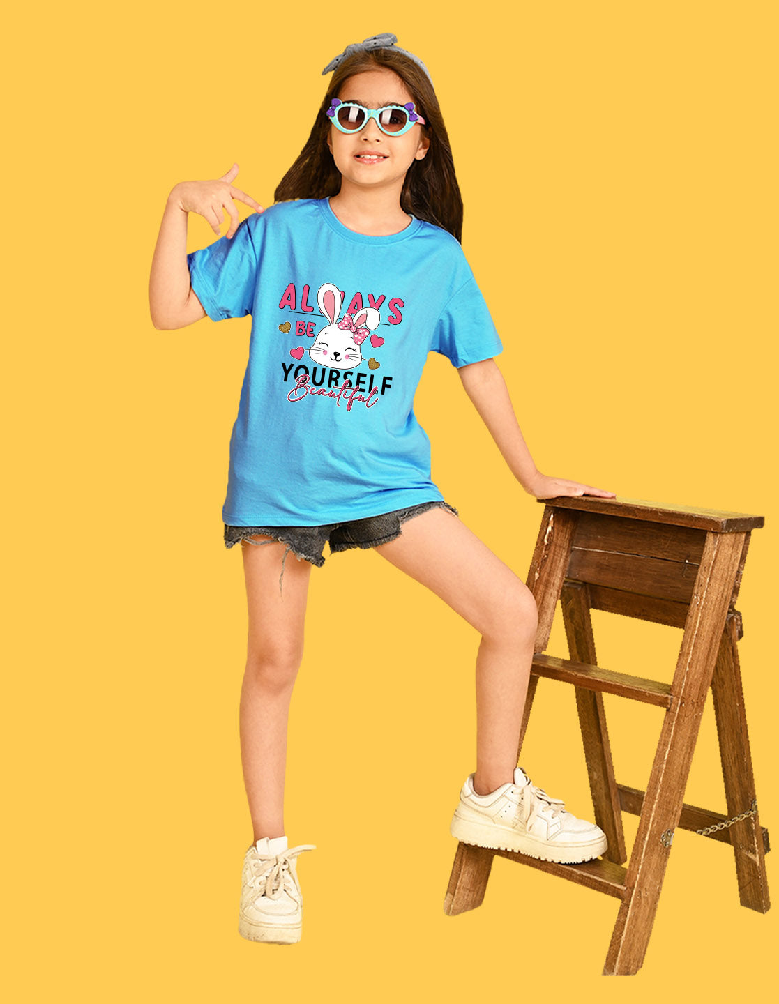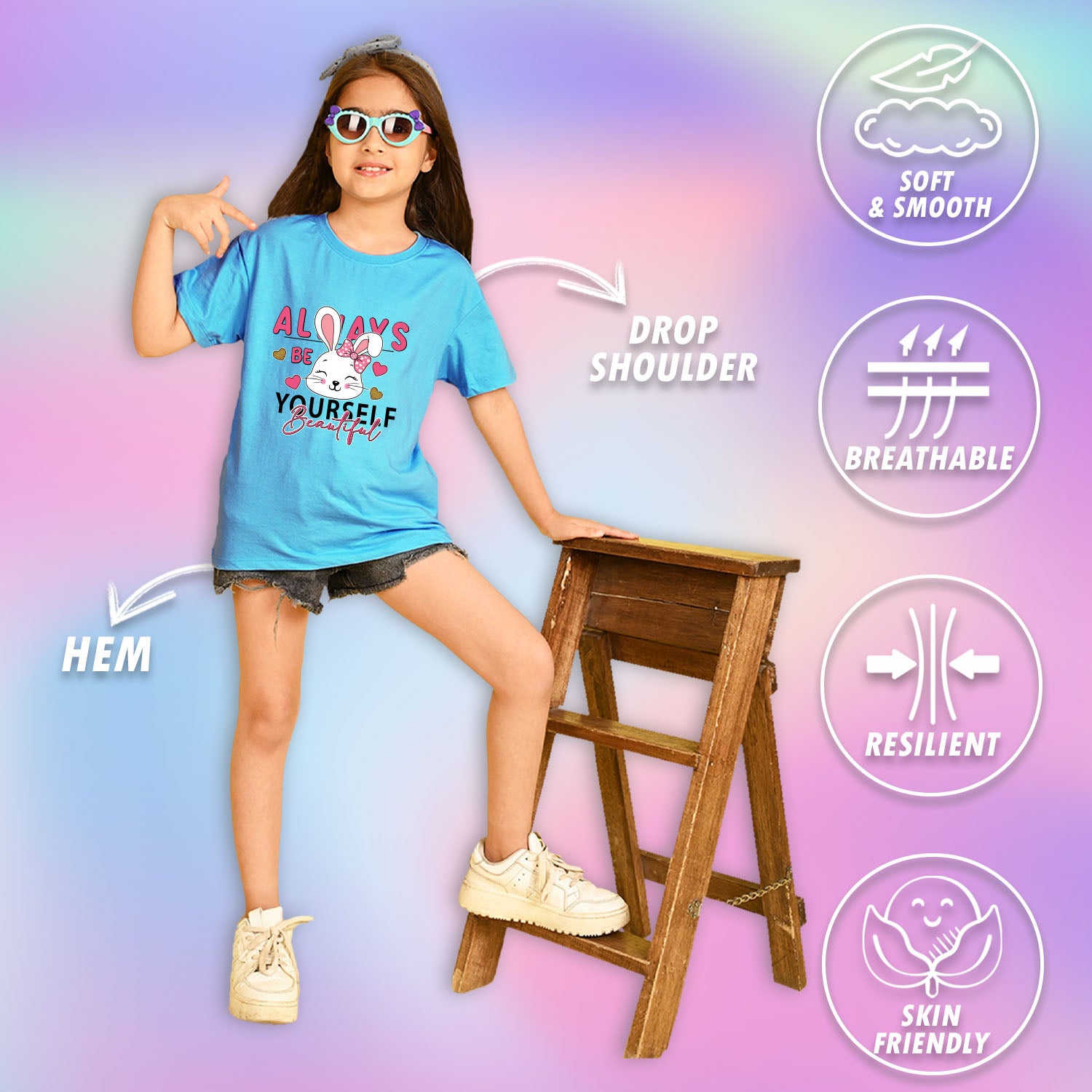 Nusyl Girls Sky Blue Rabbit & Text Printed Short sleeve Cotton Blend Oversized T-shirts