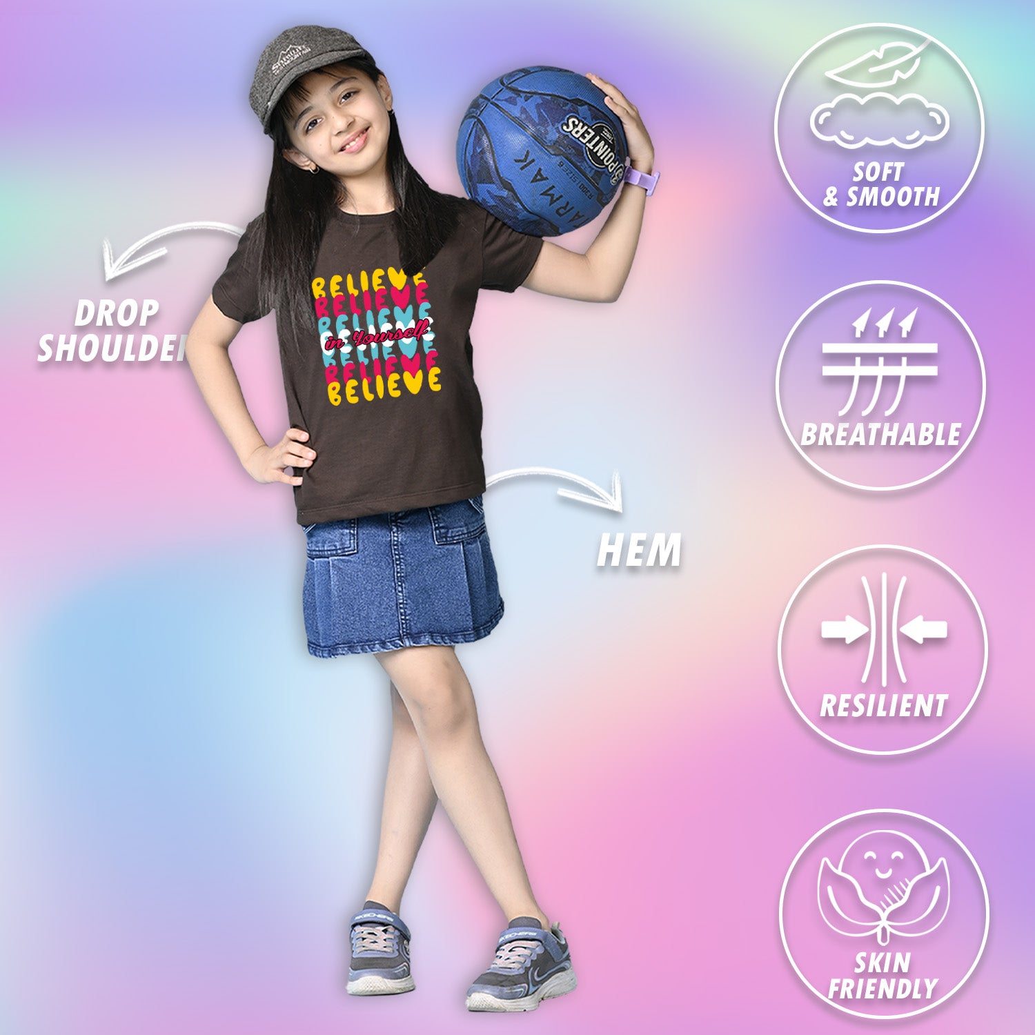 Nusyl Girls Brown Believe Text Printed Short sleeve Cotton Blend Oversized T-shirts