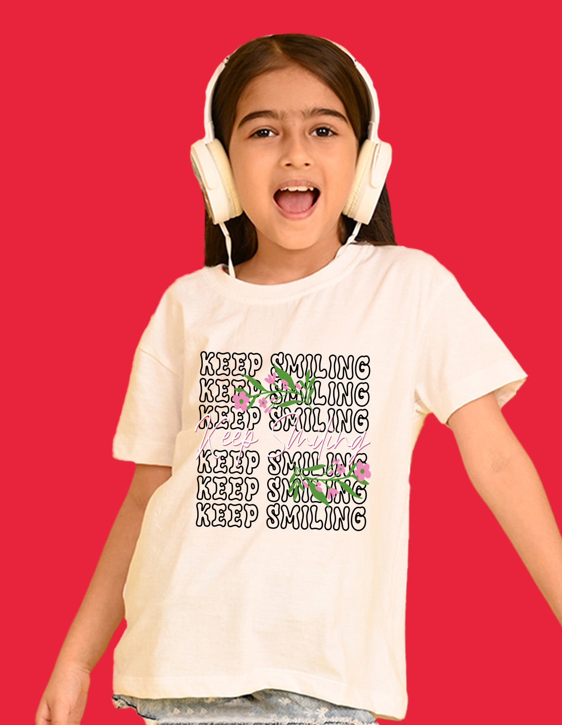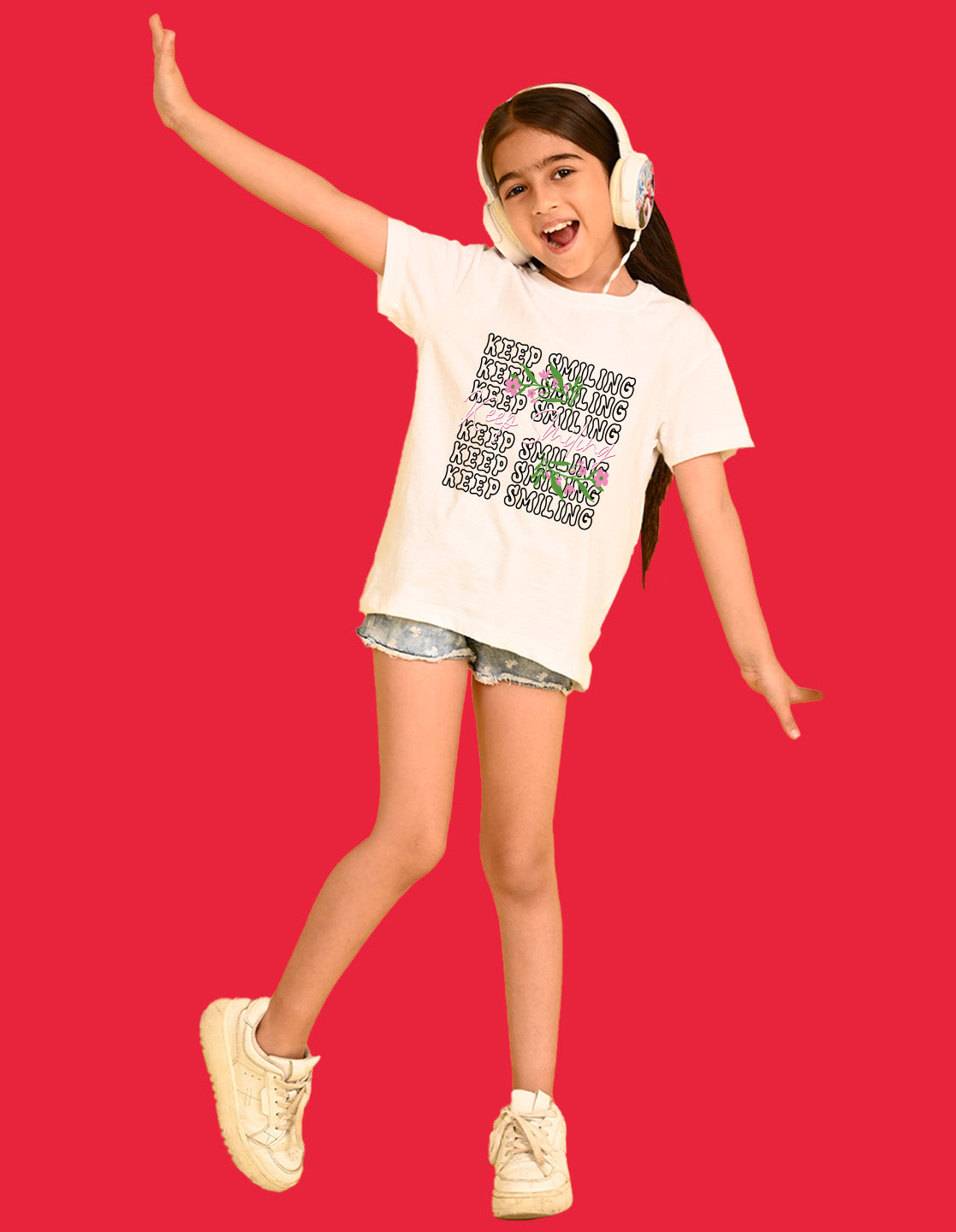 Nusyl Girls White keep smiling text Printed Short sleeve Cotton Blend Oversized T-shirts