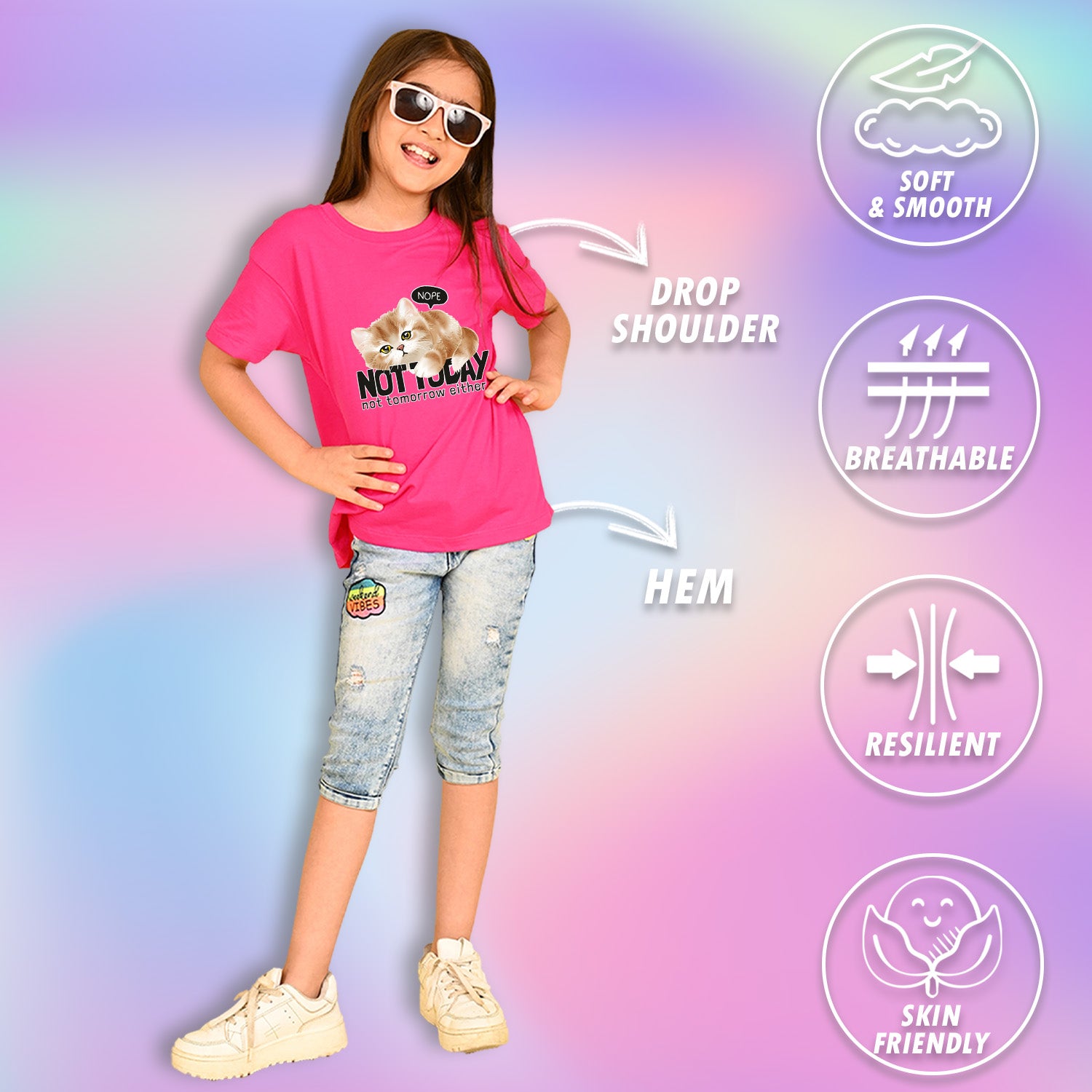 Nusyl Girls Hot Pink Cat & not today text Printed Short sleeve Cotton Blend Oversized T-shirts