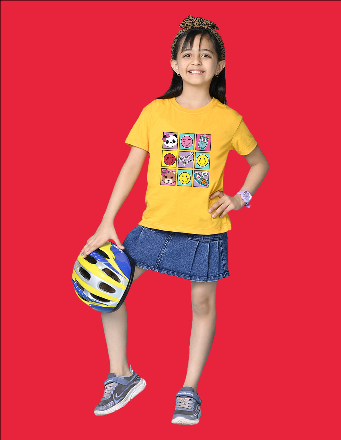 Nusyl Girls Yellow Bears and smile emoji Printed Printed Short sleeve Oversized T-shirts
