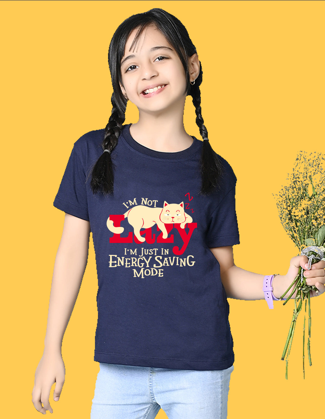 Nusyl Girls Navy Blue Lazy Text Printed Short sleeve Cotton Blend Oversized T-shirts