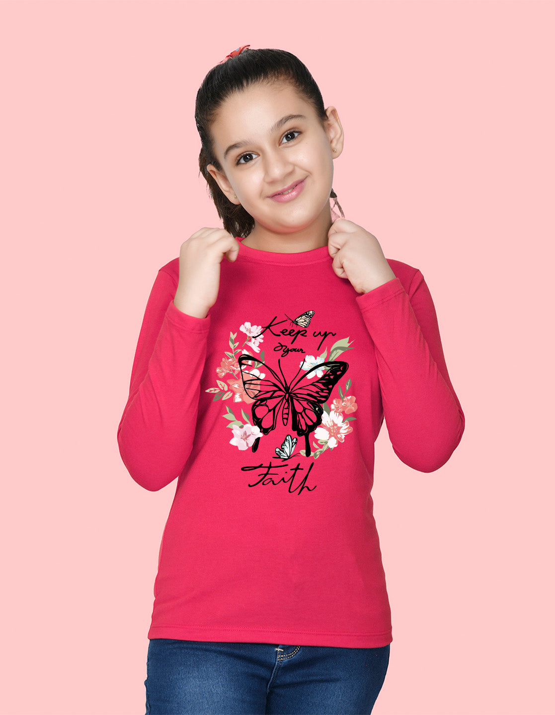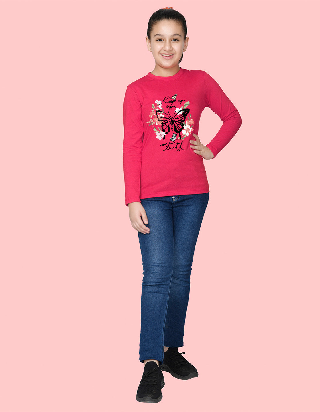NUSYL Cotton blend full sleeves butterfly & text Printed Tee-Hot Pink