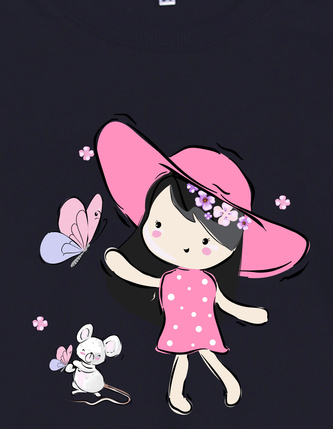 Nusyl Girl's Navy Blue Cute Girl Printed Round Neck Oversized Sweatshirt
