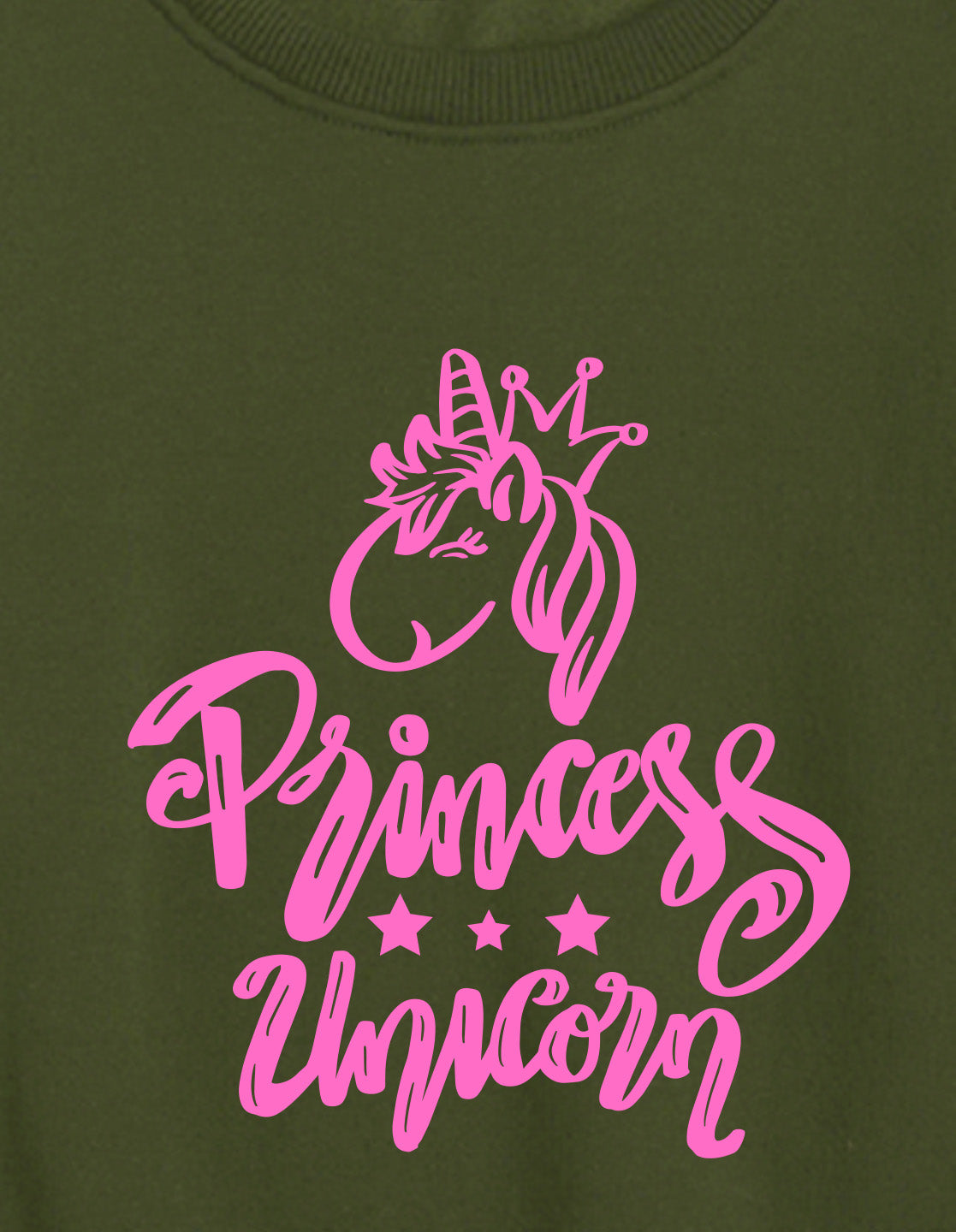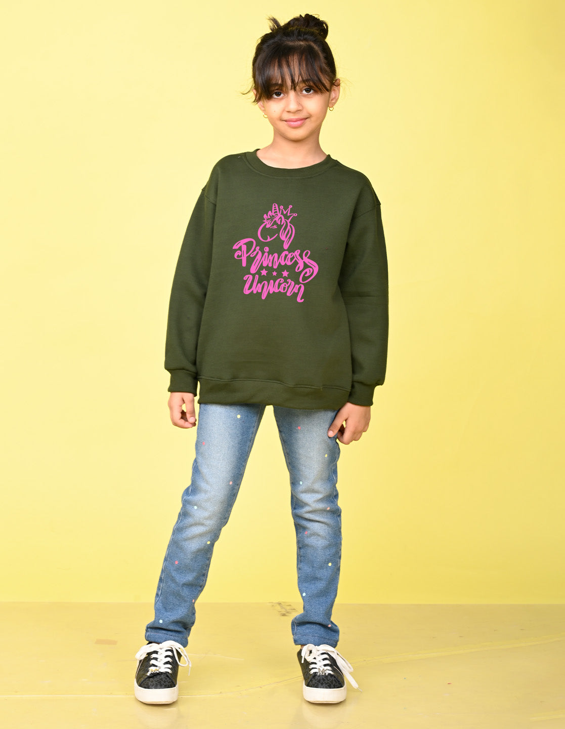 Nusyl Girl's Olive Princess Unicorn Text Printed Round Neck Oversized Sweatshirt